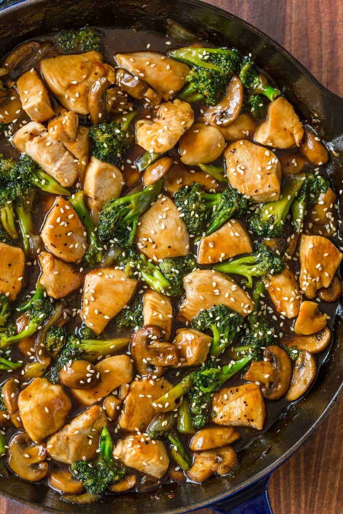 Cut chicken into small bite-sized pieces (no more than 3/4” thick) and season lightly with pepper. Heat a large heavy skillet or wok over medium-high heat. Add 1 Tbsp oil. Add chicken in a single layer and let it sit undisturbed for 1 minute to get a good sear then stir fry for another 5 minutes or until golden brown just cooked through then remove to a bowl and loosely cover to keep warm.